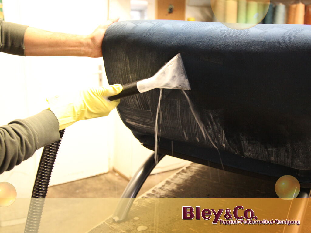 - Spülen des Bezugsstoffes mit klarem Wasser (Klarspülung) mit speziellen Extrahiermaschinen, die ein Eindringen von Flüssigkeiten in die Polsterung verhindern
